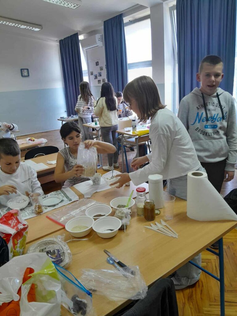 su pripremali zdravi obrok. Bilo je tu svega: chia sjemenkica,lana,sezama, raznih pahuljica,banana,jabuka,datulja,suhih smokava i šljiva,marmelade od smokava…meda.Neke od namirnica su pojedini učenici tek tada kušali,dok neki imaju “višegodišnje iskustvo”u konzumiranju istih. Datulja je zauzela prvo mjesto među novim, omiljenim namirnicama,tražilo se još